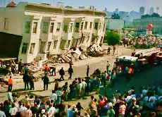 For this hollowed ground we all walked on yet today was originally mere ballast and Bay dredgings poured in for the 1915 Pan-Pacific International Expo, a makeshift sand and sledge dump too voluminous to be twice removed. What better a foundation to build on, asked some early Depression Era hustler/developers: yessir, slap up a whole new neighborhood of tacky Mediterranean-style tinderboxes on the stuff, call it the Marina, being that it was down here atop the bay. Something of a flotilla of pseudo-villas with seedling gardens, crammed single-by-multi-unit along curvaceous side streets with thematic names like Prado, Retiro, Alhambra and Rico Way—no daylight nor breathing room between them—sort of pieds-a-tiramisu, all spongy and aquiver from the start. An answer came with crushing dispatch, some 60 years later, at 5:04 pm.