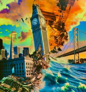 But beyond the gutter mounds of slag and buckled pavement, the steaming heaps of household refuse piling up on sidewalks to either side, what really started getting to me were visions of local laggards stumbling out curtsied, parallelogram doorways and pretzeled window casements with nary the clothes on their fat, sassy backs, leaving everything they’d long cherished and hoarded to be compacted into drenched layers of furniture, furnishings, wall hangings and housewares, floor by caving floor. Glimpses of others defiantly tunneling in and out of their precarious properties, clutching lockboxes and irreplaceable family photos of wool-suited survivors of 1906’s 5:12 am quake, or clawing furiously on all fours through the rubble of their lives to rescue pet cats and dogs. Then there were the aged and immobile, rent-controlled into place for decades, too panic-stricken to budge from their mashed and mangled routines—even as their shrinking worlds crashed down about them. That spectre only spread more viciously as emergency sirens wailed from block to block.