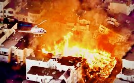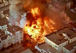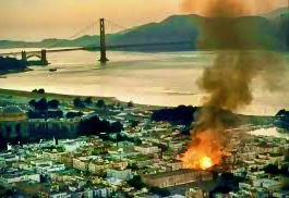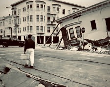 Naturally, San Francisco Bay reclaimed the Marina’s vulnerable gellulite landfill in short order, water table rising, sandy soil lifting, jerking, falling violently. The District’s rickety structures, garage door where solid walls should be, were no match for the resulting liquefaction, rolled by Loma Prieta’s temblor and its 4-point aftershocks, soft-story foundations and first floors folding quicker equity theater on such shaky ground. Mid-block Spanish bungalow homes imploded, corner Deco-detailed apartment buildings hula danced, tipped on over—suddenly everything went trapezoidal and rhomboid—total local blackout as the whole outside series crowd was watching worldwide. Stunned Giants baseball players milled about homeplate as if they’d just been collectively bean-balled; A’s teammates looked to jack one another out of the yard, squad cars converging around the infield of a panic-rocking Candlestick Park celebrating its 29th year. Meanwhile, Marina sewers spit up, water mains ruptured, gas lines snapped like pretzel sticks: Then came the flames.